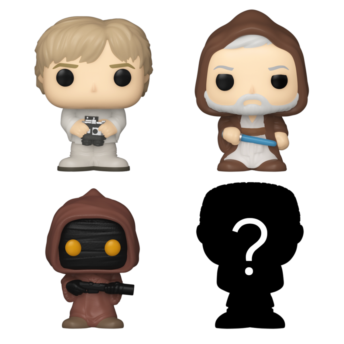 Este pack inclui 4 Bitty POPs: Luke Skywalker, Obi-Wan Kenobi, Jawa e um Bitty POP! Mistério.